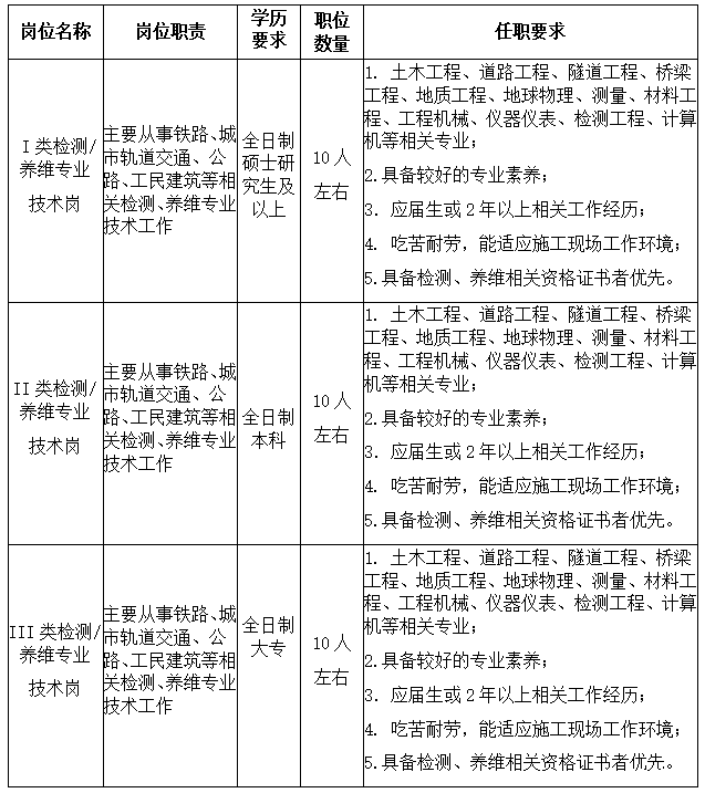 因公司发展需要,现公开招聘检测、养维相关技术人员,招聘总人数为30人左右。